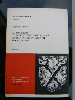 Zdaje się, że już wieki temu JG-W wraz z Szanownym Małżonkiem oczyszczali jedno z łódzkich mieszkań, przy okazji przekazując w dalsze -- jak to w legendach bywa dobre -- ręce książki z domowej biblioteczki. W moje (czy dobre, nie mnie oceniać) ręce wpadła nieduża objętościowo publikacja autorstwa Bogumiła Grotta Katolicyzm w doktrynach ugrupowań narodowo-radykalnych do roku 1939 . Autora nie kojarzyłem, ale tytuł brzmiał dobrze. Książka swoje odleżała (żadna nowość!) aż w końcu do torby podróżnej potrzebowałem publikacji niedużej, a przenośnej, i trafiło na tę właśnie. Jedną z pierwszych myśli było "ciekawe, co na ten temat napisałby endek", a tu proszę. Powiedzmy, że dobrze się złożyło -- nieznany mi wcześniej Bogumił Grott to publicysta Myśli Polskiej, Naszego Dziennika, jak również członek Komitetu Obrony Dobrego Imienia Polski i Polaków. Także trafiłem. dobrze. Książka składa się z czterech rozdziałów: I. Nacjonalizm narodowo-radykalny "nacjonalizme...
